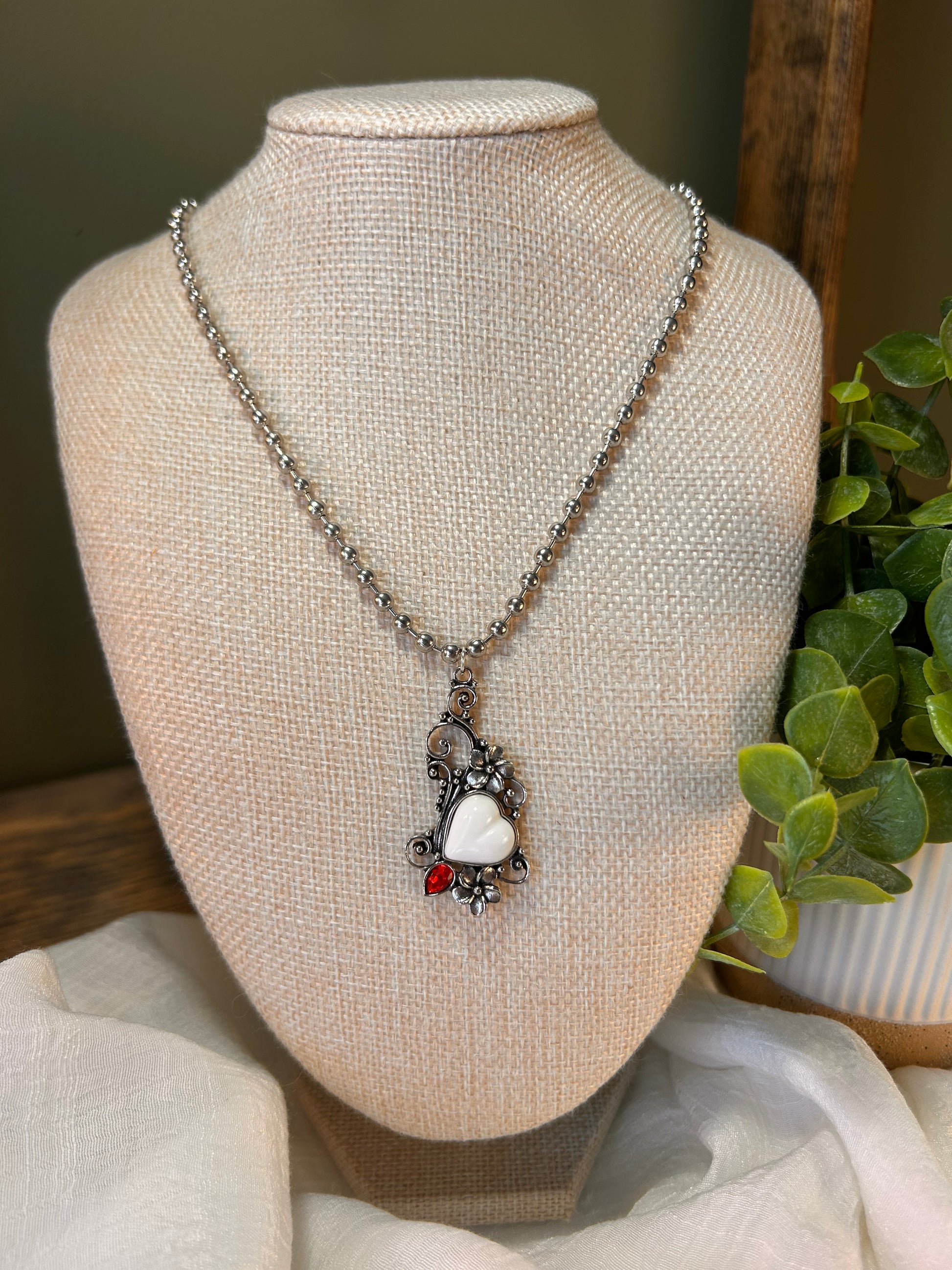 Single pendant on a 18” chain, white heart with a tiny drop of simulated ruby
