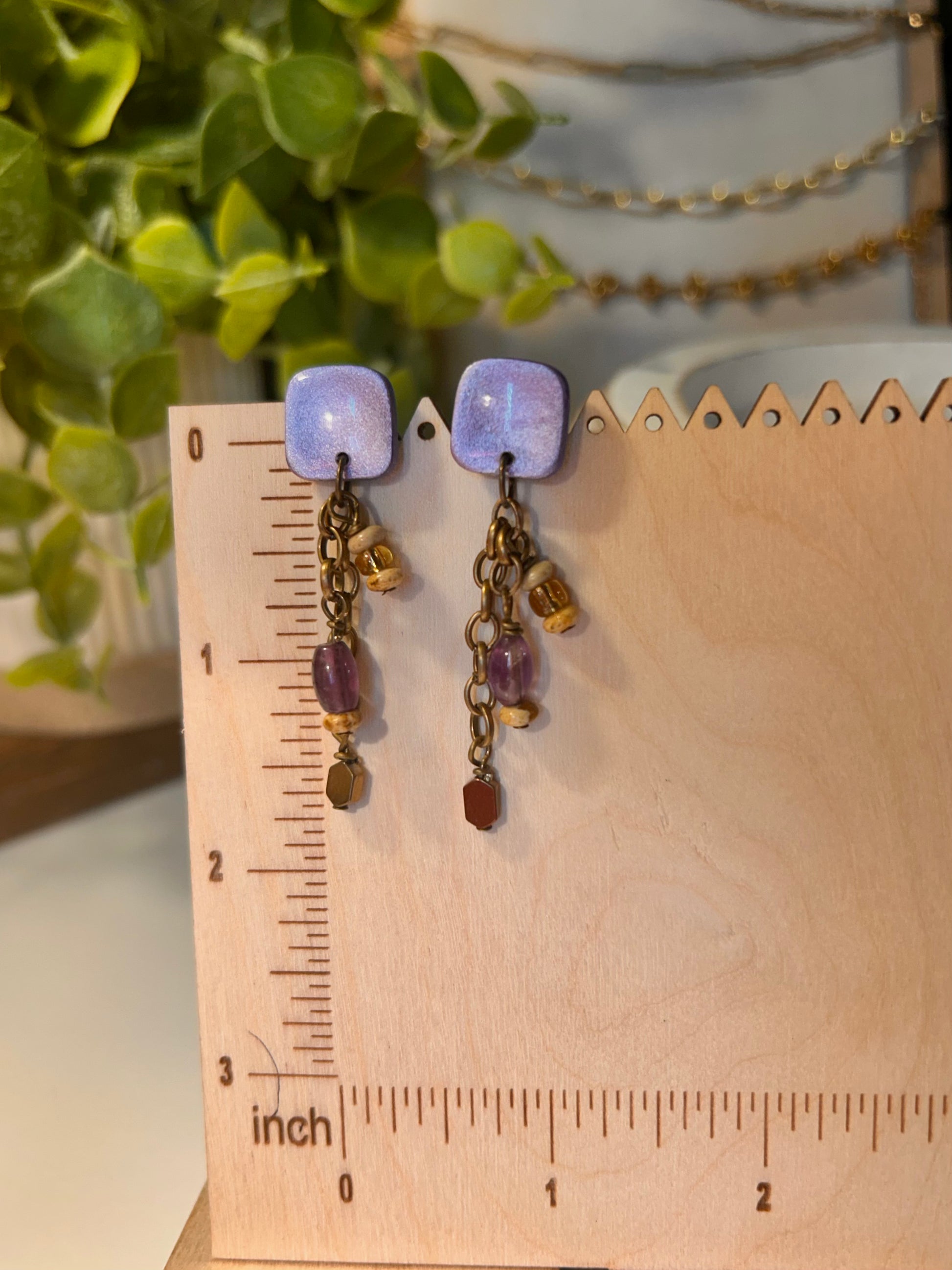 Rounded Square Deep Amethyst Purple Beaded Dangle Earrings