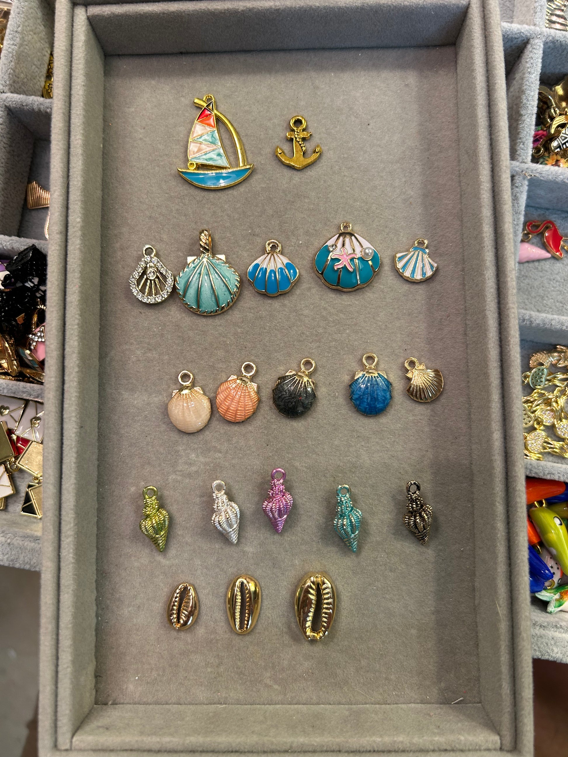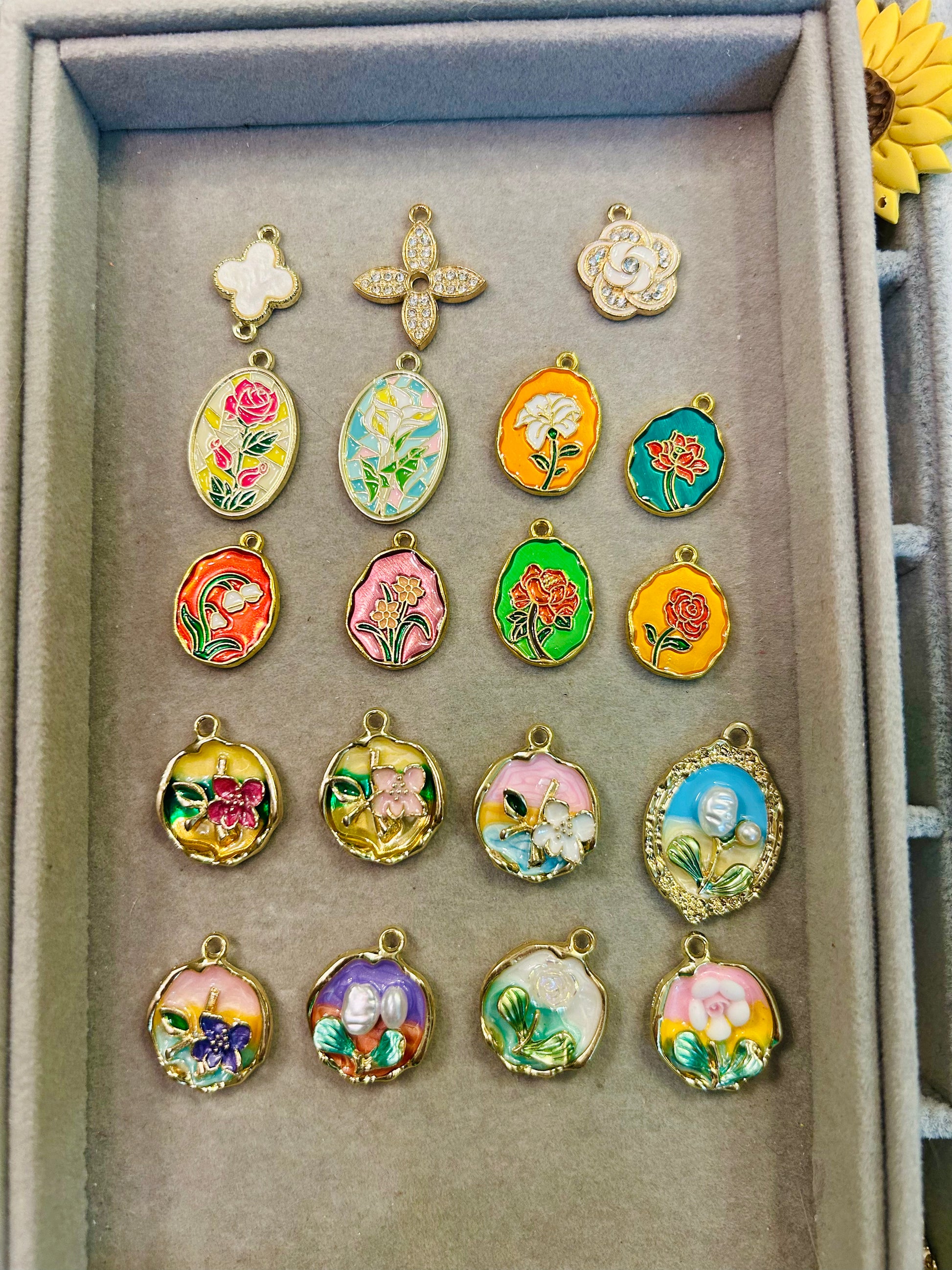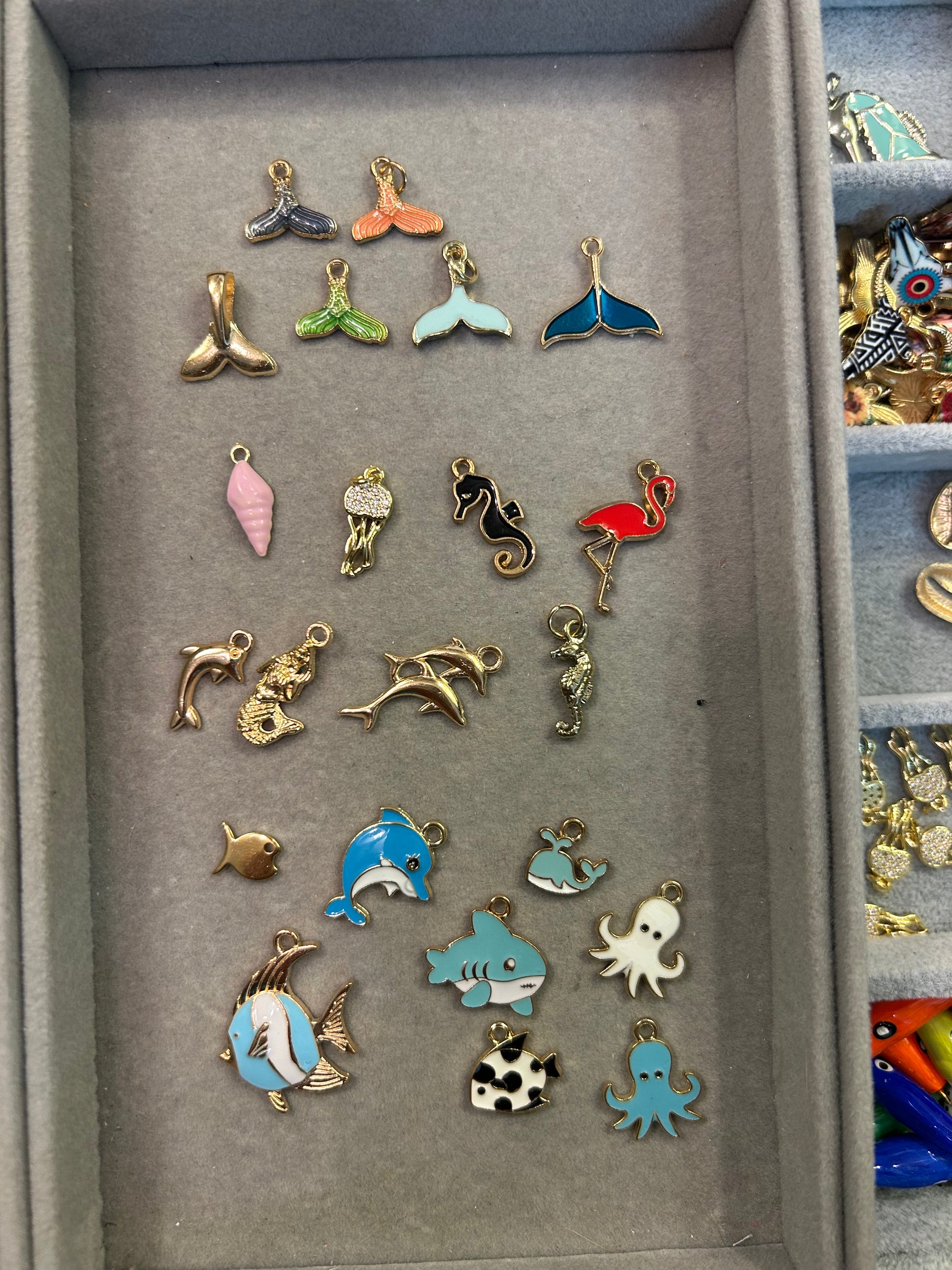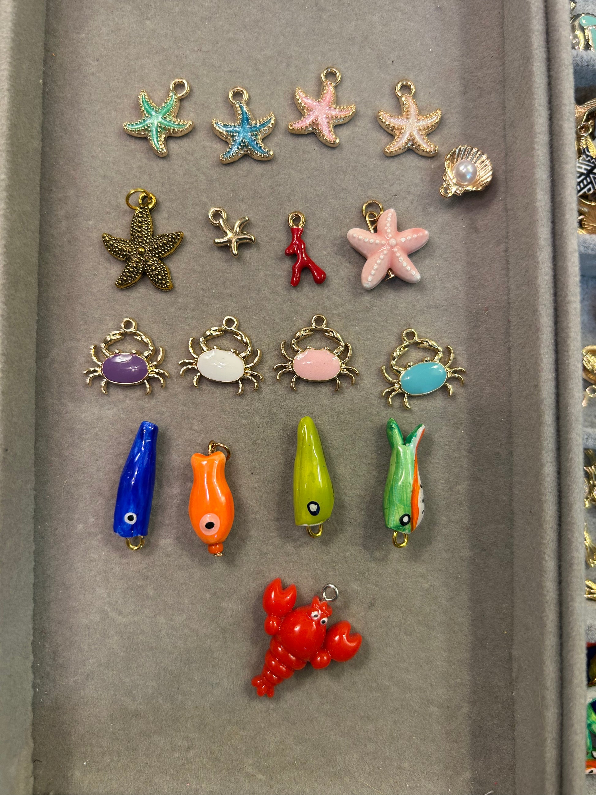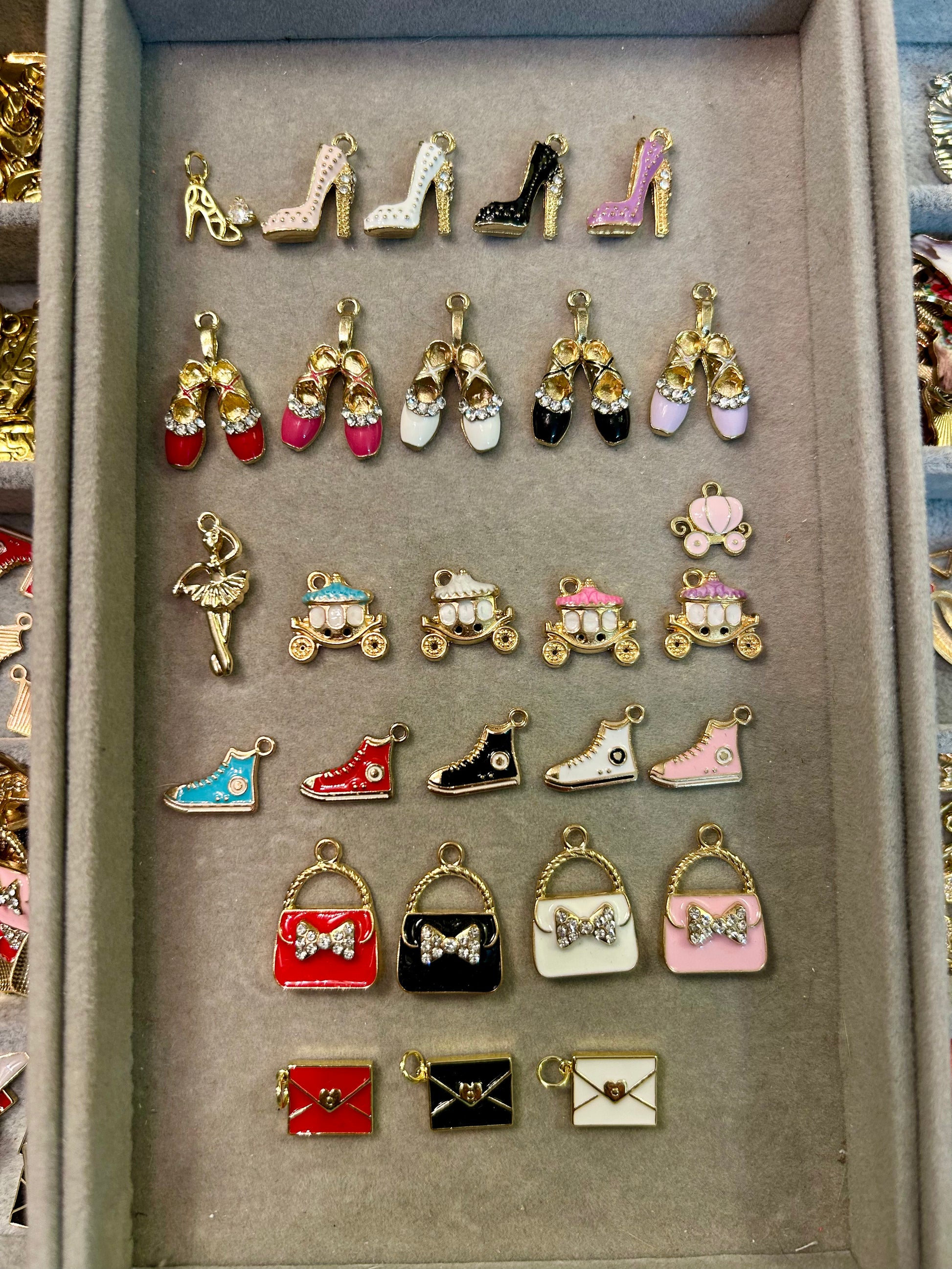 1) You choose the minimum number of charms you think you want. We can add in if needed.2) In the comment box at checkout, please list any details about your charms or chain. Delicate, or paperclip, chain metal type, colors of charms or themes. Some example photos have been included in the pictures area, but our charms change weekly.