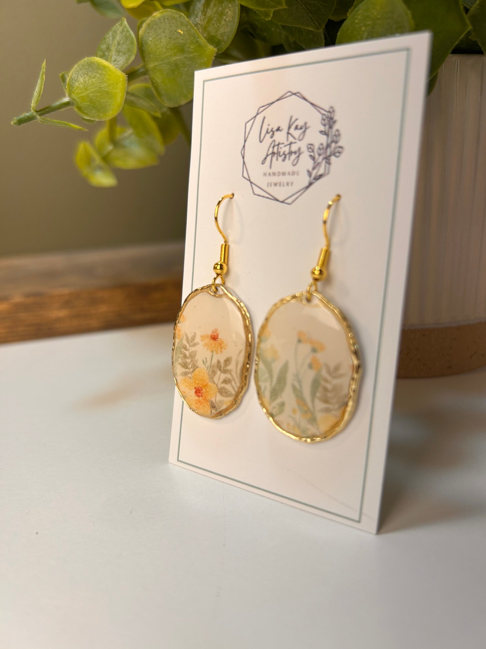 Our softest water color graphic framed in a 14k gold plated metal frame. A top coat of hard resin secures the frame to the clay.