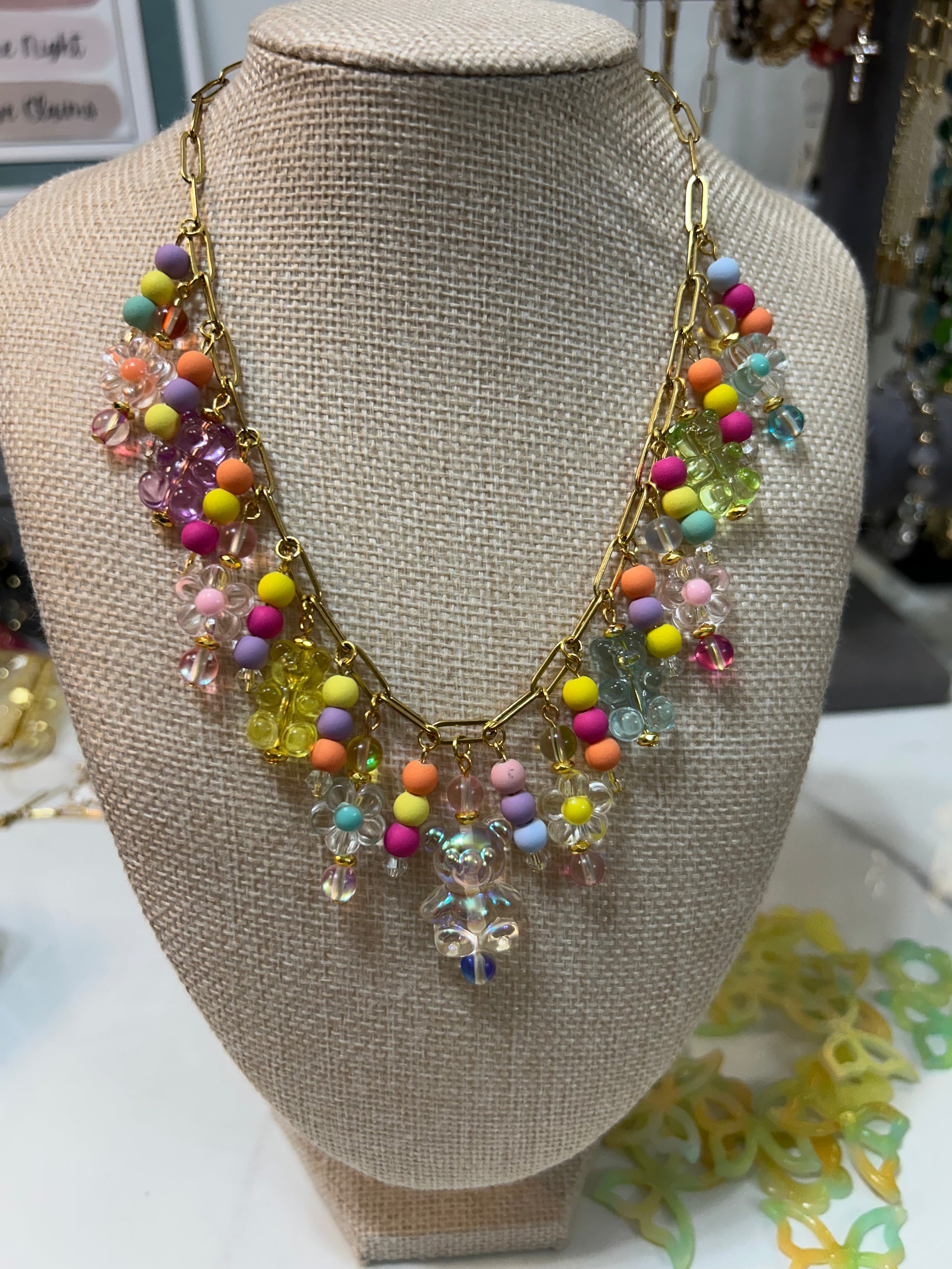 Acrylic gummy bear charms, embellished with golden beads, colorful hippie daisies, and tri-color beads all on a gold tone paperclip 20” chain with a 2” extension.