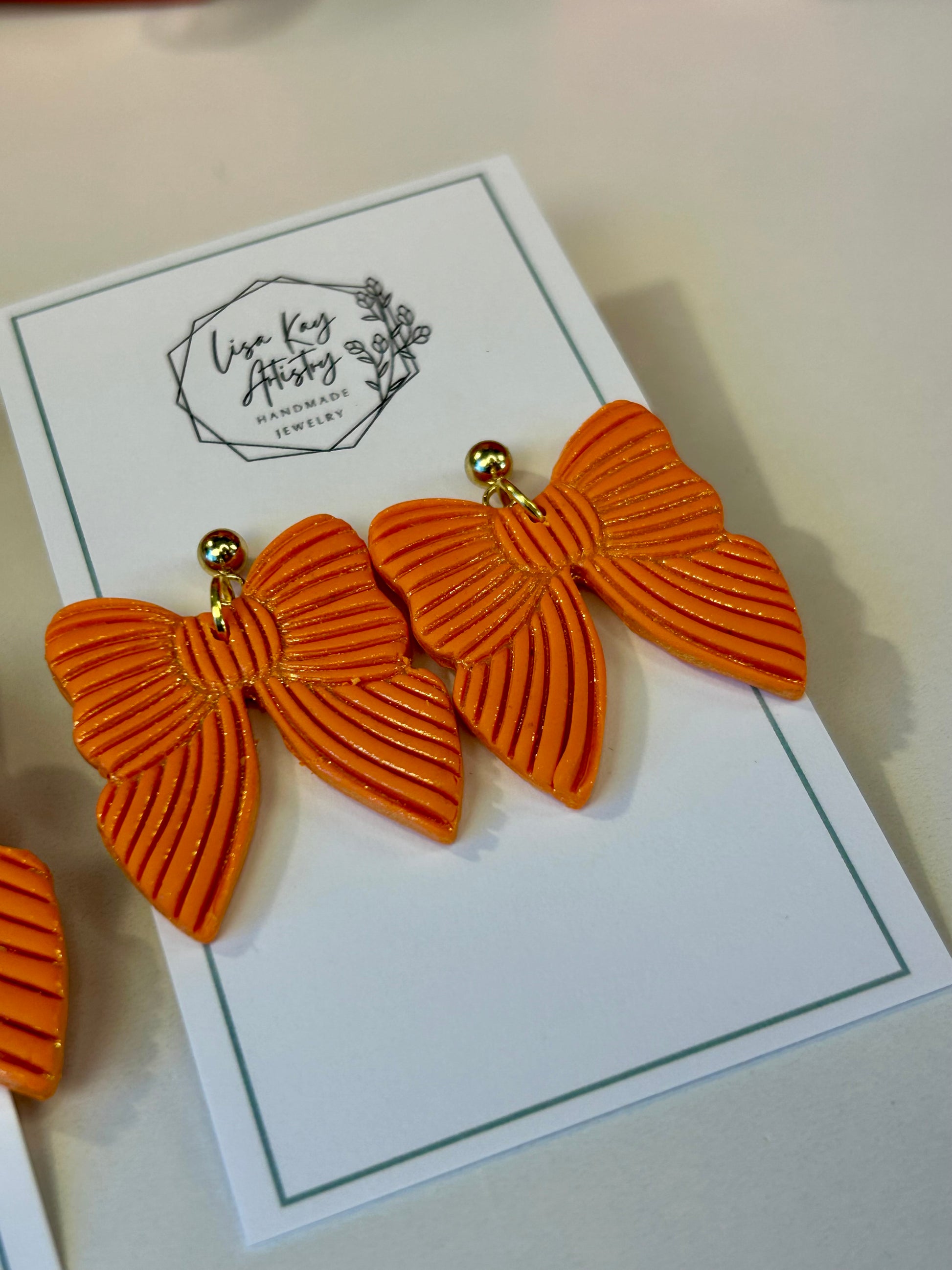 Bright, bold, and impossible to ignore. These handmade orange polymer clay earrings are embossed for rich texture and finished with a glimmering mica powder that catches the light with every move.