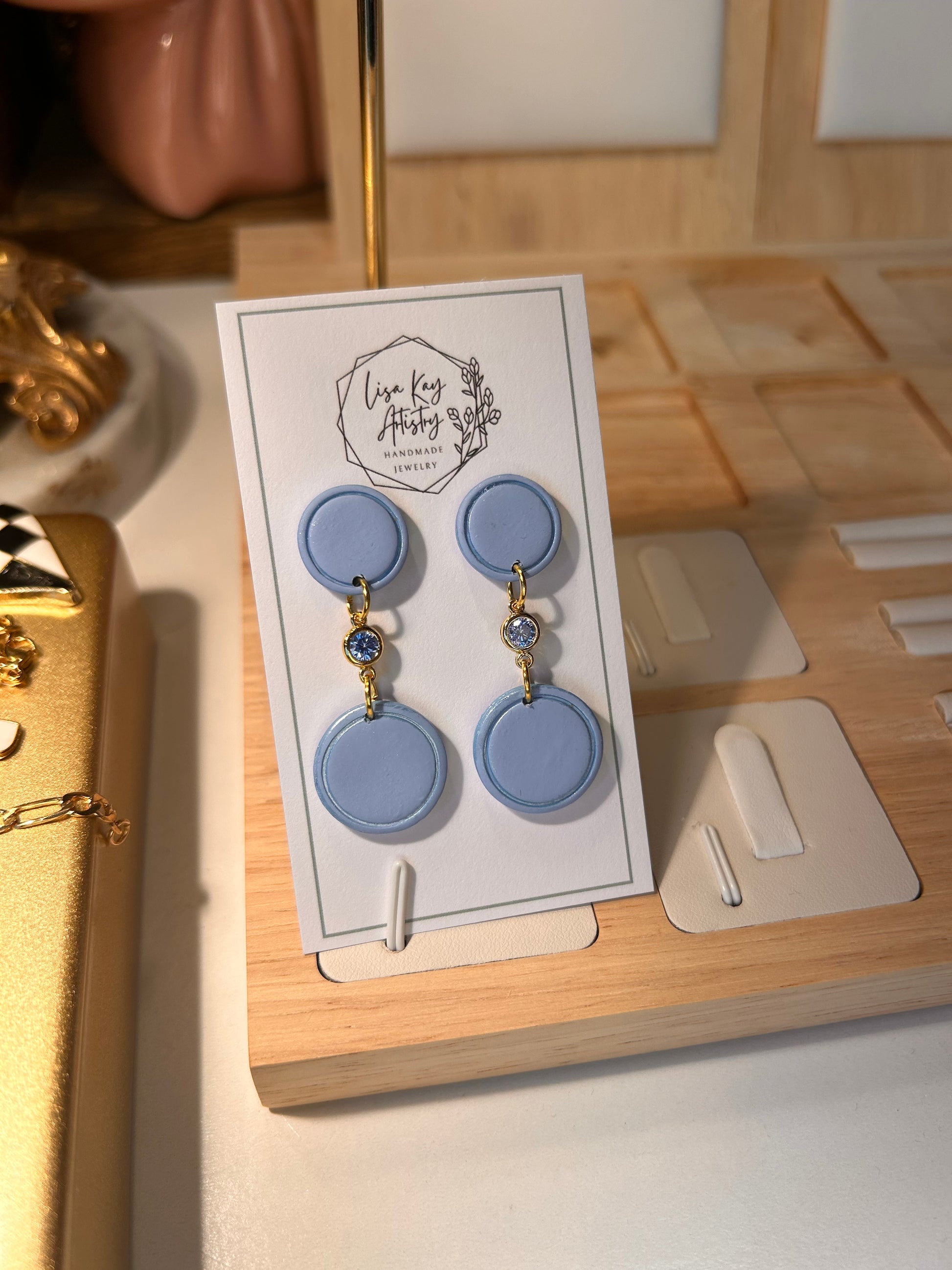 Our softest blue that reminds you of the clear blue skies, late winter, when the moon is still awake in the sky. A clear blue crystal is surrounded by an 18k gold plated charm connecting the embossed circles.