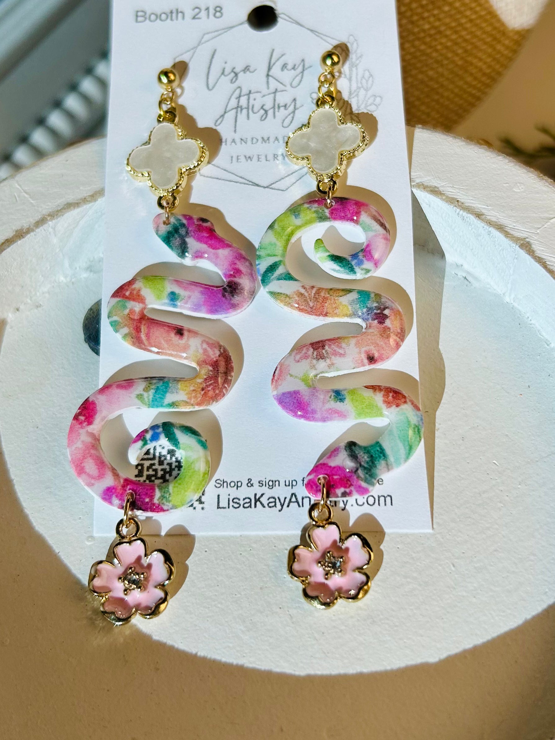 Our 2” polymer clay snakes embellished with a clear pink clover charm and delicate pearls. Bringing this 2025 trend to you! Total drop length a bit over 3 inches.