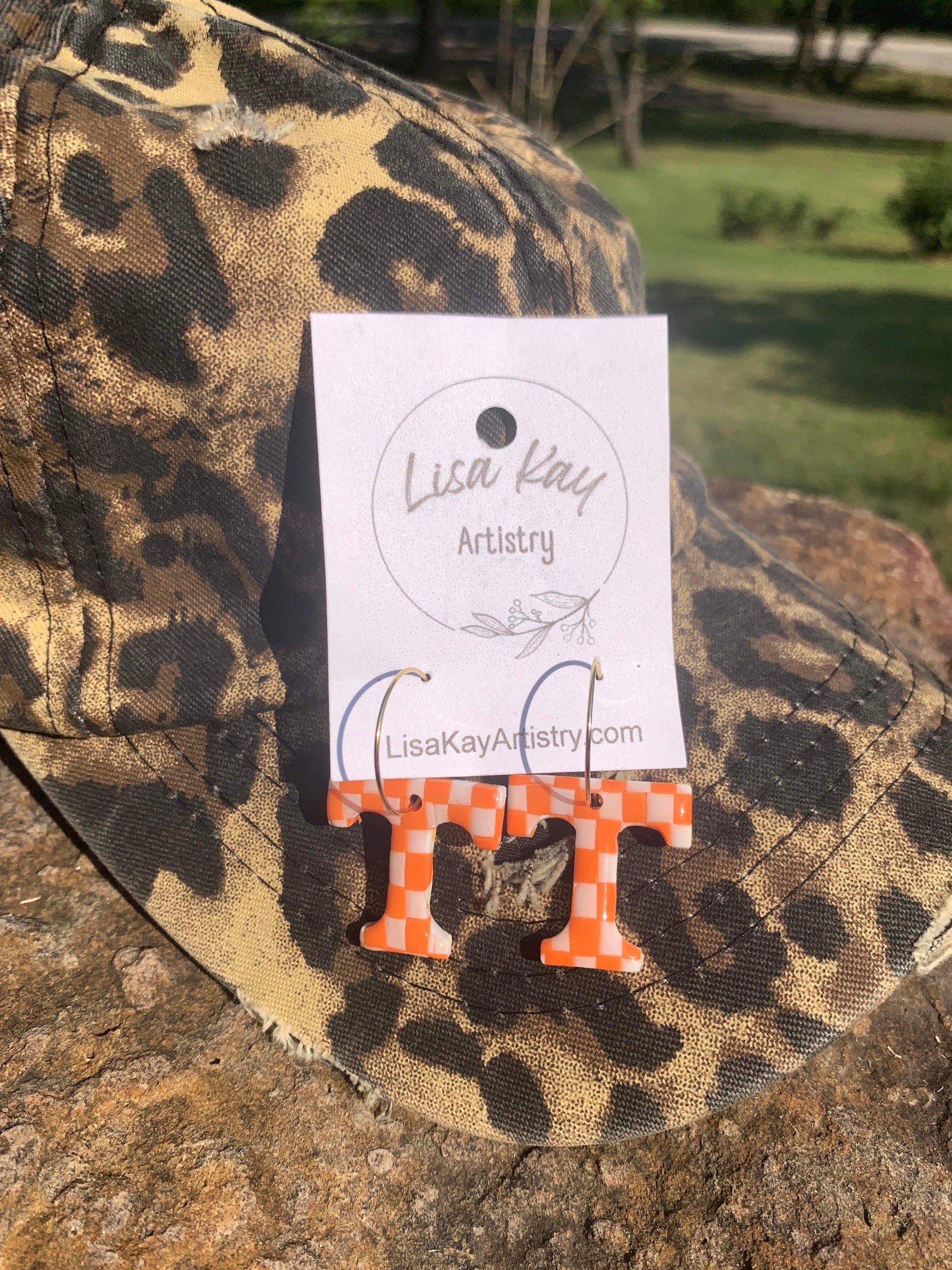 Handmade checkerboard orange and cream Power T on a wire hoop. 1 inch by 1 inch.