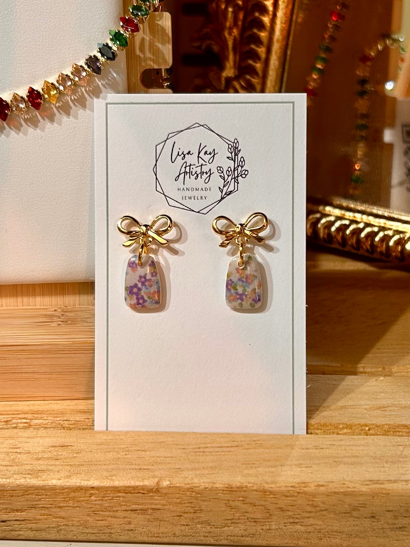 18k gold plate bow and poly clay florals in purple, yellow, orange and blue. Sweet! Measures a total drop length of just over 1/2 inch! Total tip to top is just under 3/4 inch.