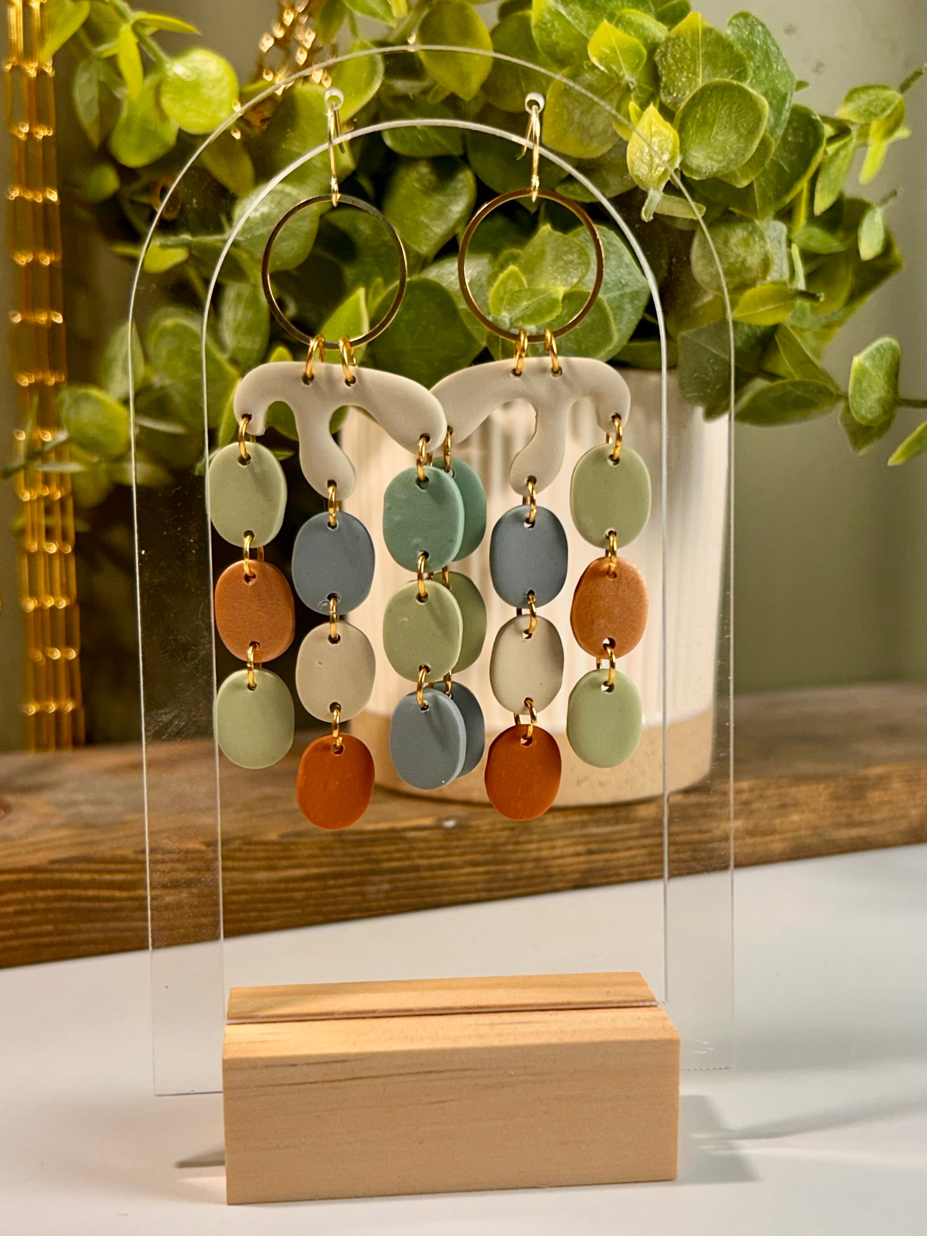 Ten pieces of our color-coordinated ovals and an abstract Matisse inspired anchor. Topped with a brass circle for a bit of glam. 14k gold plated French hooks.